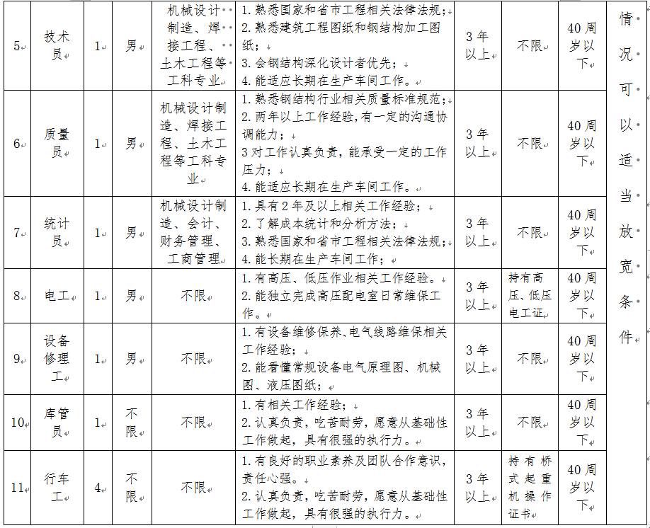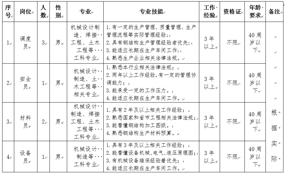 選聘人員包括調(diào)度員3名,安全員1名,材料員2名,設(shè)備員1名,技術(shù)員1名,質(zhì)量員1名,統(tǒng)計員1名,電工1名,設(shè)備修理工1名,庫管1名,行車工4名。具體要求如下: